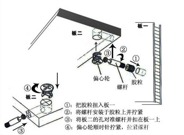 一、用墊布點好地板,先從靠墻的一端寬側(cè)板開始組裝,將寬側(cè)板平放于地面上(離后墻面保持700mm間隔)。首先將填好的三合一膠塞的板件,平放在墊布上,檢查孔距與圖紙相符,并裝上三合一單連桿。然后將固層釘上木塞,固定于寬側(cè)板上面,頂板大柄孔朝上,其余固層都朝下,腳線大柄孔朝內(nèi)(中間固層與L架高度一致,即底板到固層內(nèi)空為960mm,現(xiàn)場打?qū)影蹇祝。放上?cè)板,釘上木塞,木塞要求連通兩邊的固層。在第二個柜固層上面裝好雙連桿,留意雙連桿上面大柄只能鎖住一半,即90°。當兩件固層與側(cè)板固定后再同時擰緊大柄。裝第三個柜時重復第二個柜的安裝步驟。 二、釘背板:把裝好的整體柜側(cè)放在點好墊布的地板上面,墊平側(cè)板成統(tǒng)一平面。用拉尺量好柜子的對角尺寸,調(diào)至相等,從寬測板處開始裝第一塊背板,留意假如中間有固層釘釘子時,先用鉛筆畫好固層的中央線,再釘釘子。 三、L架的安裝:用L架的側(cè)板在對應(yīng)的側(cè)板上面一平行線,然后上移9mm畫出三合一膠粒的中央線,用L架的頂班在相對應(yīng)的底板上面畫一平行線,平線內(nèi)進9mm畫出三個一膠粒的中央線。用10mm鉆頭開孔,孔深10-20mm。裝上單桿。L架裝好后在背板上加釘子固定。清理衣柜安裝位雜物,左右各站一人,衣柜向后稍斜,用力提起,向后移到所需位置留意不要刮花地板、墻壁。